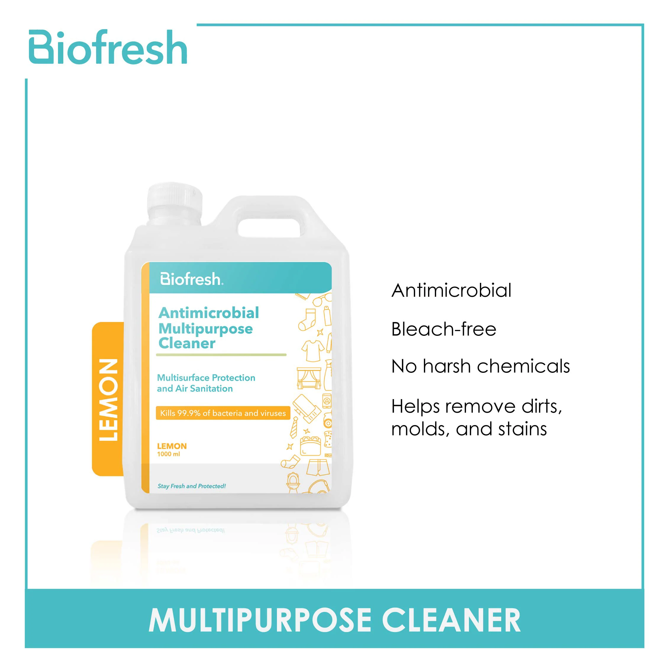 Biofresh Antimicrobial Multipurpose Cleaner effectively disinfects all types of surfaces by removing dirt, molds, mildews, and stains without damaging color and texture. It is scientifically formulated using Biofresh’s Antimicrobial Formula that kills 99.9% bacteria, microbes, and viruses while retaining surface quality using alcohol and bleach-free solution.