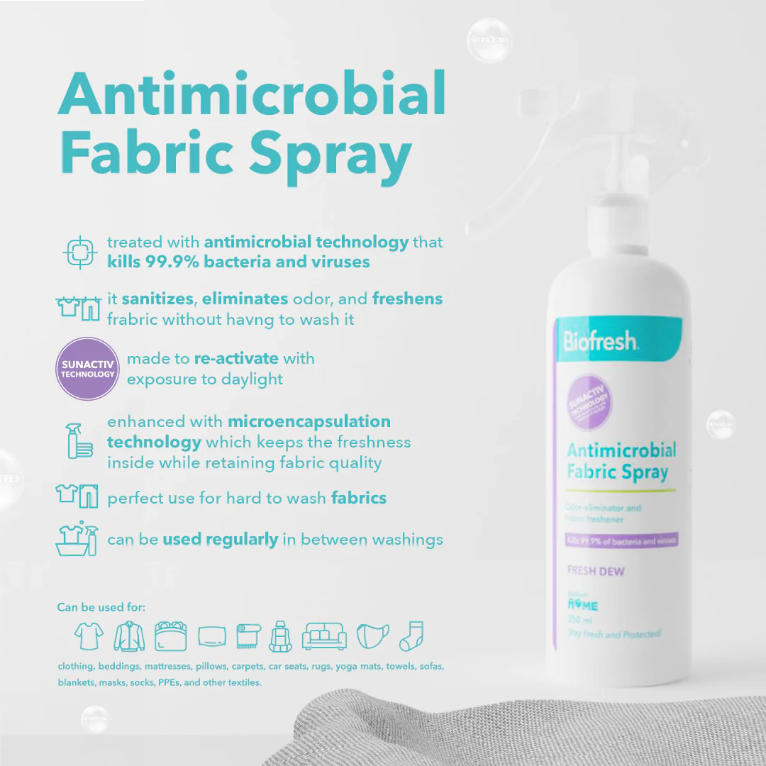 Biofresh Disinfectant Fabric Spray is formulated to kill 99.9% of bacteria, microbes and viruses that may grow in fabrics. It sanitizes, eliminates odor, and freshens fabric without having to wash it. It is enhanced with microencapsulation technology which keeps the freshness inside while retaining fabric quality. Perfect to use for hard to wash fabrics and can be used regularly in between washings.